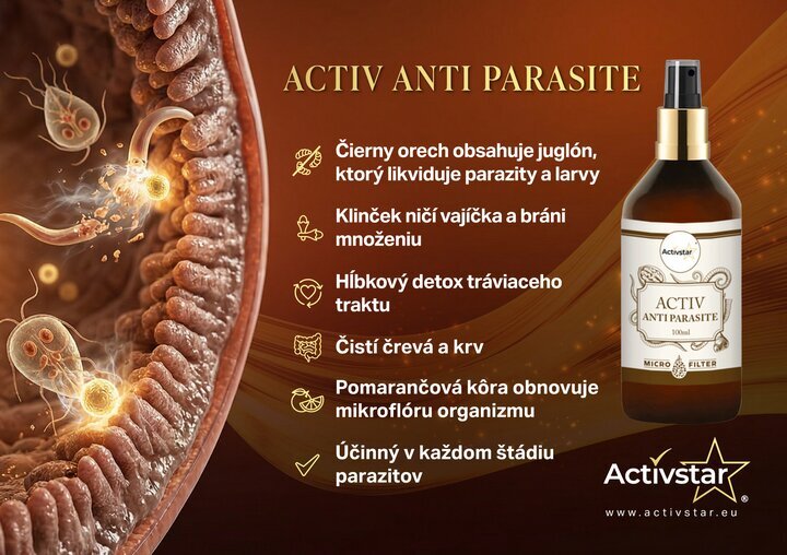 ACTIV ANTIPARASITE ist ein Nahrungsergänzungsmittel in Form eines praktischen Sprays mit pflanzlichen Inhaltsstoffen, die traditionell zur Pflege des Verdauungstraktes und des inneren Gleichgewichts des Körpers verwendet werden.