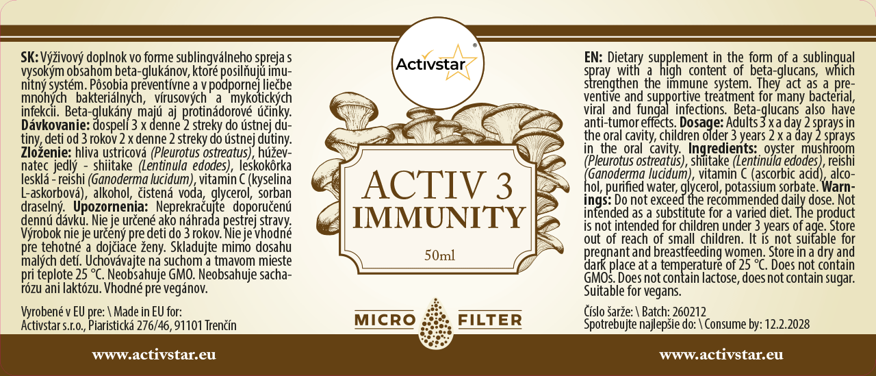 Activ 3 Immunity ist ein Nahrungsergänzungsmittel in Form eines Sublingualsprays mit einem hohen Gehalt an Beta-Glucanen aus Pilzen. Es wurde entwickelt, um das Immunsystem zu stärken und den Körper in Zeiten erhöhter Belastung zu unterstützen.
