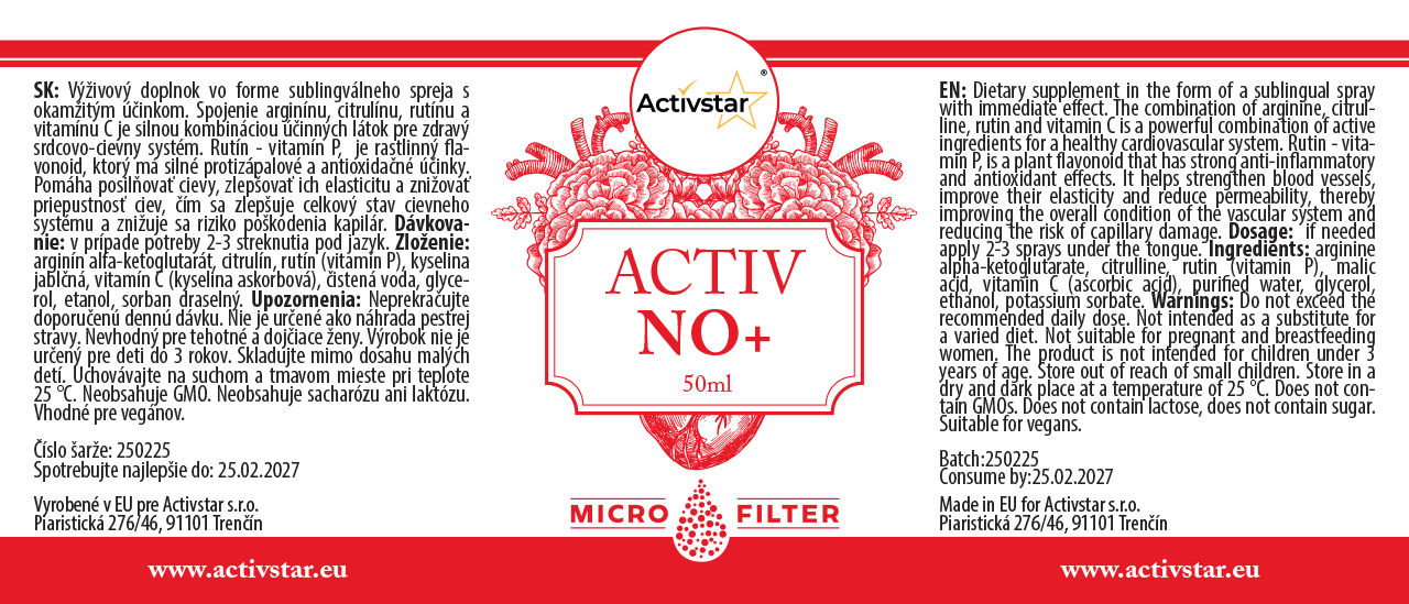 ACTIV NO+ ist ein Nahrungsergänzungsmittel in Form eines Sublingualsprays mit Sofortwirkung. Die Kombination aus Arginin, Citrullin, Rutin und Vitamin C ist eine äußerst leistungsstarke Wirkstoffkombination, die die Gesundheit der Blutgefäße, die Mikrozirkulation und die allgemeine Fitness des Herz-Kreislauf-Systems unterstützt.