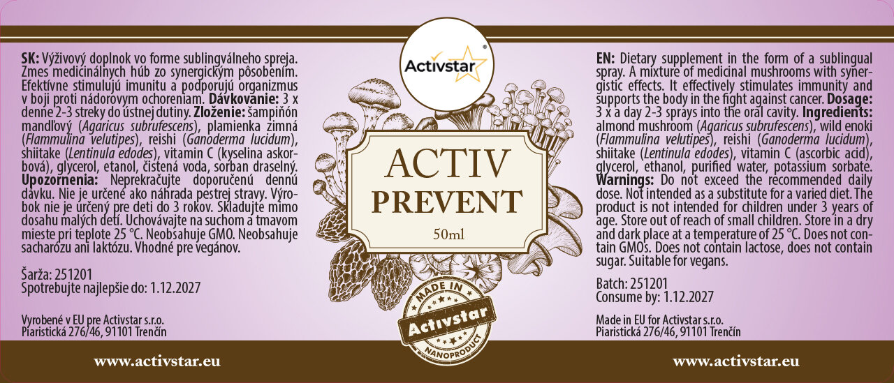 ACTIV PREVENT ist ein Nahrungsergänzungsmittel in Form eines sublingualen Sprays, das die Kraft von Heilpilzen mit einer synergetischen Wirkung verbindet. Es unterstützt das Immunsystem, die Vitalität des Körpers und trägt zum Zellschutz bei. Dank der sublingualen Verabreichung werden die Wirkstoffe bereits in der Mundhöhle schnell absorbiert.