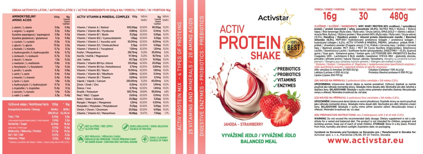 Ihre Gesundheit zu fördern und den ganzen Tag über Energie zu erhalten. Und das alles mit einem köstlichen Bananengeschmack, der Ihren Gaumen erfreuen wird. Activ Protein Shake Strawberry ist mehr als nur ein Proteingetränk - es ist Ihr neuer Verbündeter auf dem Weg zu mehr Fitness, Gesundheit und Vitalität!