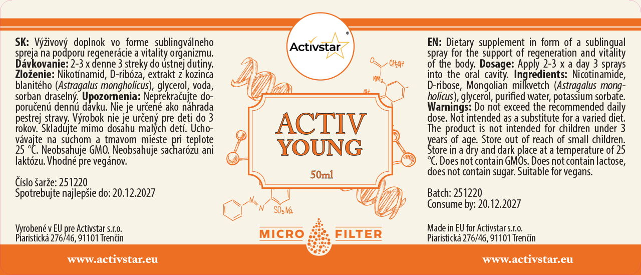Activ YOUNG ist ein Nahrungsergänzungsmittel in Form eines sublingualen Sprays, das die Zellerneuerung, Vitalität und Energie des Körpers unterstützt. Dank seiner einzigartigen Zusammensetzung wirkt es schnell und effektiv – es wird direkt in der Mundhöhle aufgenommen.
