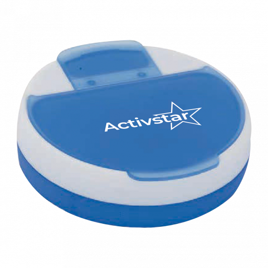 Runde Medikamentenbox aus Kunststoff mit 4 Fächern.